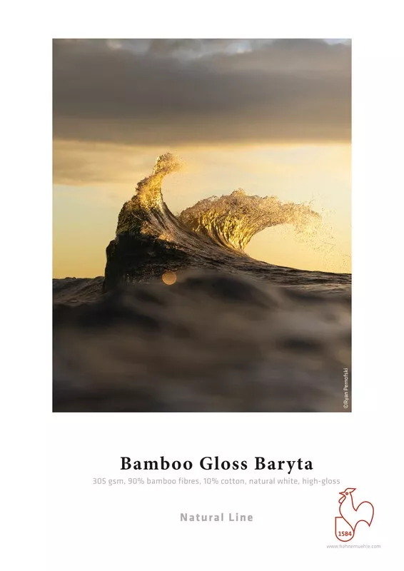 Hahnemühle Bamboo Gloss Baryta sätter en ny standard som världens första FineArt-bläckstrålepapper tillverkat av 90 % bambufibrer med en förstklassig högblank baryta-bläckstrålebeläggning. Det naturliga vita papperet kommer i en behaglig varmvit nyans och innehåller inga optiska vitmedel. I kombination med sin lätt strukturerade yta erbjuder Hahnemühle Bamboo Gloss Baryta en naturlig estetik med utseendet och känslan av ett analogt barytapapper. Den högblanka premiumbläckstrålebeläggningen ger exceptionella utskriftsresultat med definierad återgivning av färger och detaljer, djupa svärta och slående kontraster. Det extra bariumsulfatet i beläggningen förbättrar tonomfånget, skärpan och klarheten i trycket. Hahnemühle Bamboo Gloss Baryta är syra- och OBA-fri och uppfyller de högsta standarderna för åldersbeständighet. Den unika blandningen av hållbara bambufibrer, mjuk ytstruktur och enastående tryckkvalitet ger ett oöverträffat uttryck och djup till konstverk.