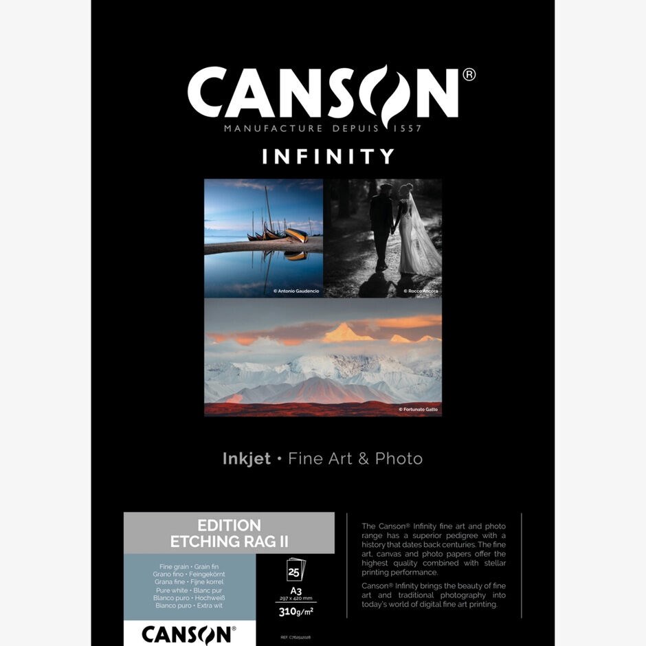 Edition Etching Rag är ett matt 100% bomulls Fine Art paper med en len textur med väldig svag gräng, som påminner om koppartryckspapper. Det har en ren vit ton utan användning av optiska vitmedel (som förkortar livslängden på ett papper). Det är ett papper av museumkvalitet som ger djup svärta, hög skärpa, maximal färggradering. Det gör det perfekt för detaljerade bilder, färgfoto, svart/vita foto, alldeles speciellt till porträtt. Pappret har hög hållbarhet mot åldrande eftersom det innehåller naturliga mineraler.